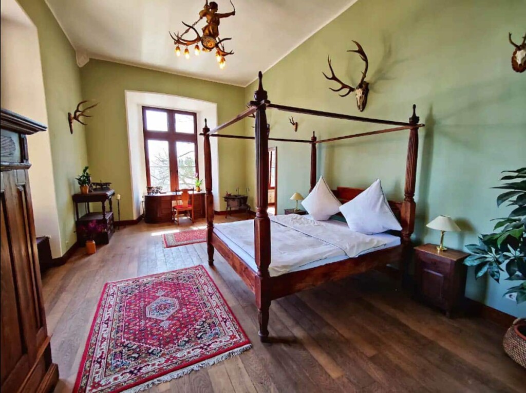Spavaća soba u tornju s krevetom s baldahinom pravi je užitak za buđenje – posebno za prekrasnog sunčanog dana kada se može uživati u fantastičnim pogledima s prozora na tri strane. Dolje će gosti pronaći originalni starinski zahod i igrice na temu ubojstva koje se mogu igrati. Kuća može primiti do 10 gostiju, po cijeni od 27 eura po osobi.