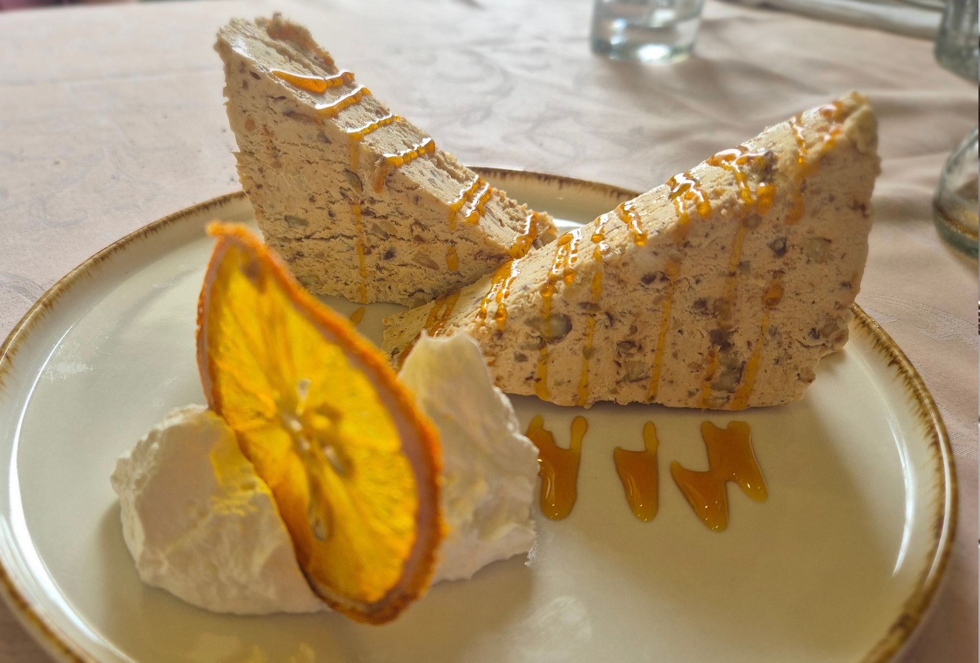 Spomenimo još da smo uz meso naručili miješanu salatu u kojoj je, čini nam se, bilo njihovo domaće povrće, rajčica je imala miris i okus, a njihovo domaće maslinovo ulje savršeno ju je pratilo. Desert, semifreddo, bio je osvježavajuć, karamelast i orašast. Nakon podijeljenog predjela i obilnog ručka desert smo isto podijelili i jedva dovršili, što dovoljno govori o veličini porcija u konobi Kopačina.