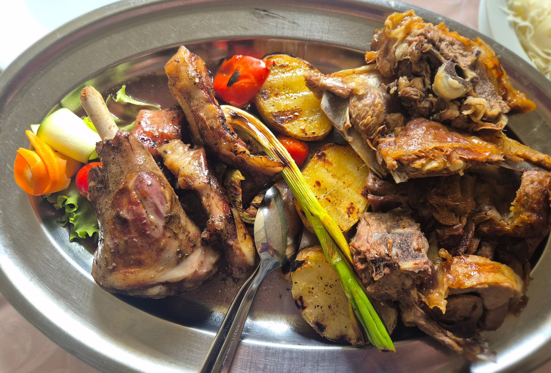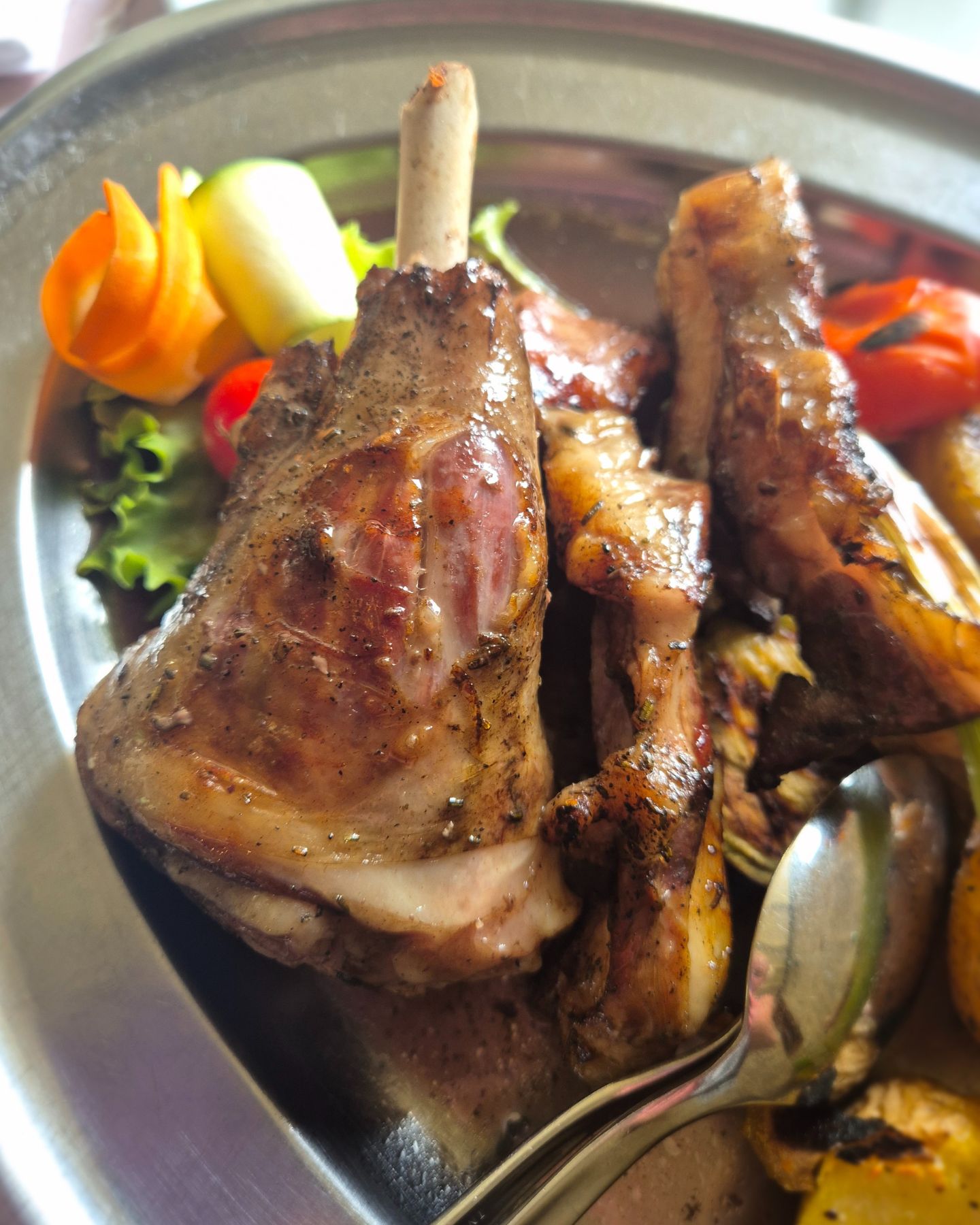 Potom na stol stiže zvijezda našeg ručka. Na ovalnom pladnju poslužili su nam porciju janjetine s ražnja i porciju sous vide janjetine, s nekoliko krumpira i nešto povrća. Svakako je pohvalno što nas je konobar unaprijed pitao imamo li neke želje što se tiče dijelova životinje, volimo li neke komade više od drugih. Rekli smo da nam sami iskombiniraju i to su odlično napravili.