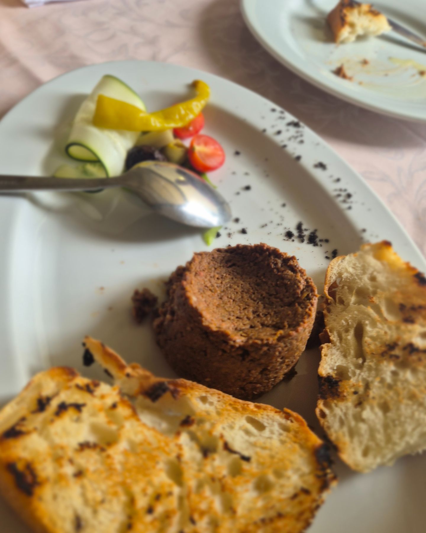 Pred nas stiže predjelo, tamna pašteta od jetrica i prepečeni kruh, a ljubazni konobar odmah nas obavještava da je maslinovo ulje na stolu njihovo, domaće i da ga obavezno probamo. Pašteta je bila odlična, aromatična, ali začini nisu prekrili okus janjetine. S par kapi maslinovog ulja, predjelo je bilo savršeno, a količina takva da smo odmah shvatili da je dobro što smo ga odlučili podijeliti.