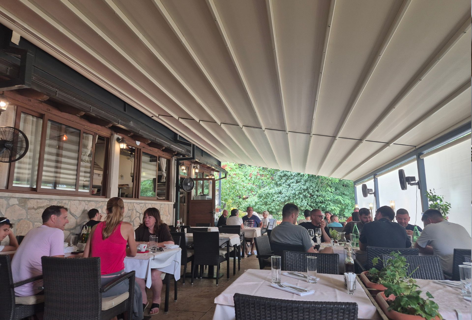 Restoran se nalazi na uzvisini iznad ceste, terasa je zaštićena gustim krošnjama stabala, a parkirnih mjesta ima sasvim dovoljno. Uspinjemo se do terase na kojoj vlada prilična gužva, iako je neko čudno doba dana, oko 16 sati, taman između ručka i večere.