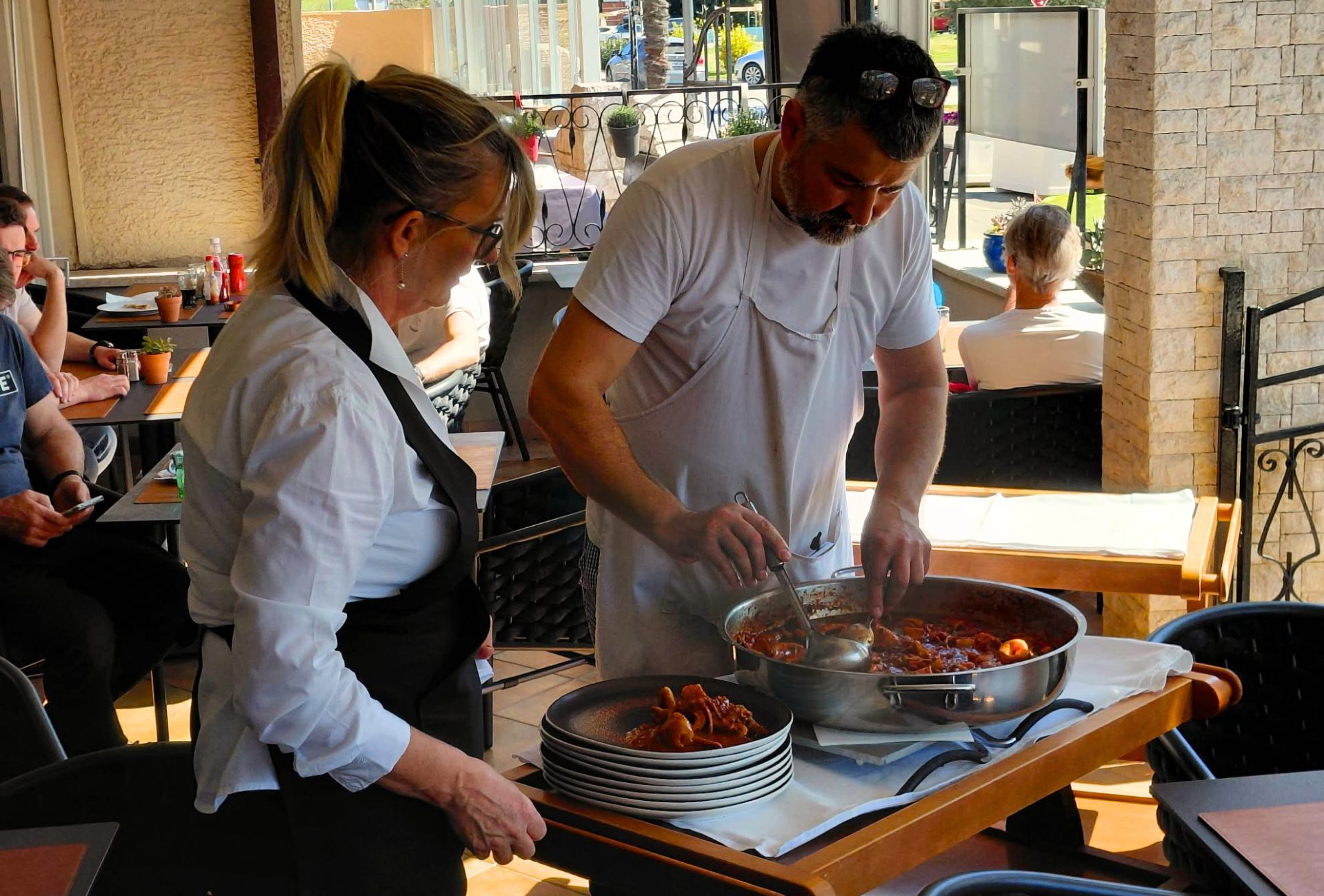 U restoranu Dvi palme poseban doživljaj predstavlja i sam način posluživanja. Umjesto na tanjuru, jela su nam stigla u velikoj padeli u kojoj su i pripremljena, a zatim su ih Christian i Snježana servirali nama pred očima. ”Najbolji dio uvijek ostane u loncu, a mi ga uvijek rado podijelimo s grupom gostiju koja naruči isto jelo. Mislim da je i njima gušt umakati kruh u saft koji ostane na dnu padele, a mi se onda šalimo da ćemo imati manje posuđa za prati”, smije se naš sugovornik.