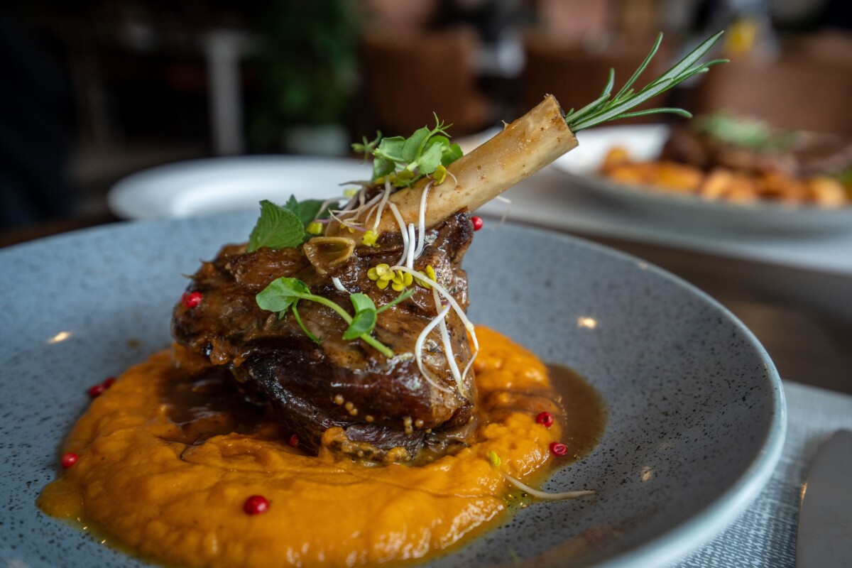 Predjelo smo preskočili, a za glavno jelo smo odabrali janjeću koljenicu s pireom od batata, te teleći franch rack s pireom od graška i krumpirom. Izbor nije bio jednostavan: privukli su nas i juneći obrazi, teletina a la peka, janjeći kotleti, pačja prsa… Posebno je impresivan popis odrezaka.