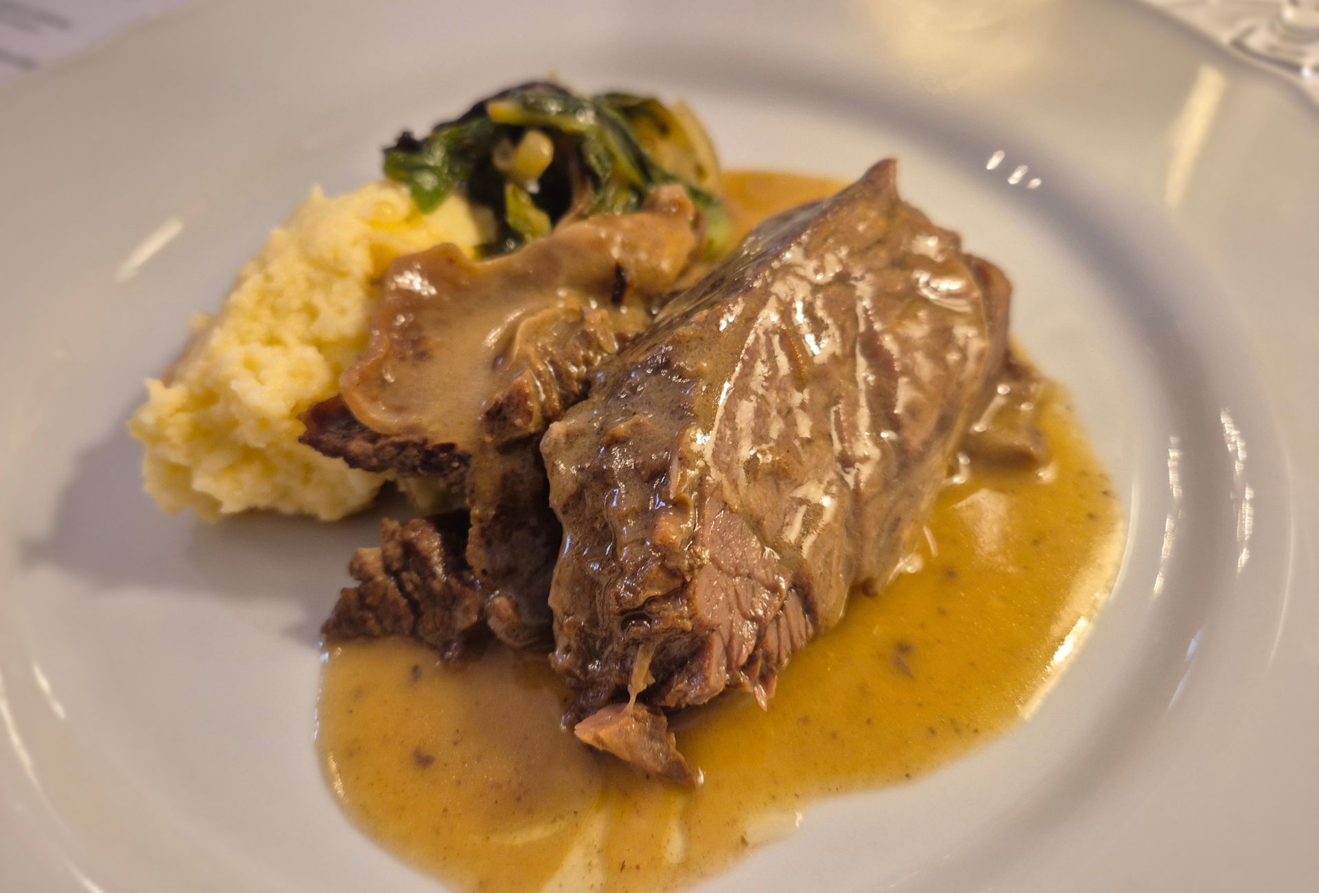 Nakon ovakvog početka, znali smo da ni glavno jelo neće razočarati. I zaista, flam od boškarina u umaku od maslinovog ulja bio je savršeno mekan, sočan, a oduševio nas je i pire s kojim je poslužen. Priprema se s jajem i dovršava kratko u pećnici, što je tajna njegove zanimljive teksture i punog okusa.