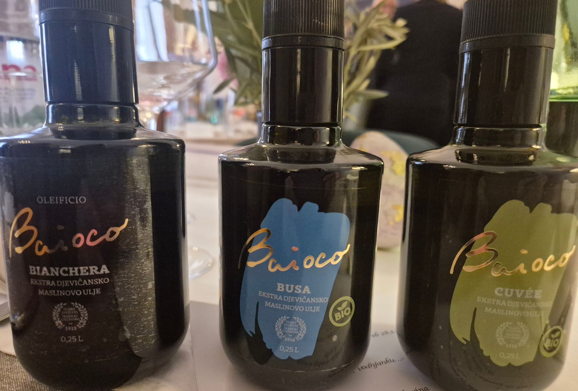 Istarski okusi ne bi bilo kompletni bez vrhunskog maslinovog ulja, koje je pratilo sva jela i bilo njihov neodvojivi dio, te istarskih vina. Uz jela su poslužena Baioco ulja iz Galižane, malog mjesta tik uz Vodnjan, a pili smo cijenjena i nagrađivana vina Veralda s položaja između Buja i Brtonigle. Od ulja smo imali priliku probati istarsku bužu, kao i neizostavnu bjelicu, ali i cuvee više sorti, koji je iz svake sorte izvukao ono najbolje.