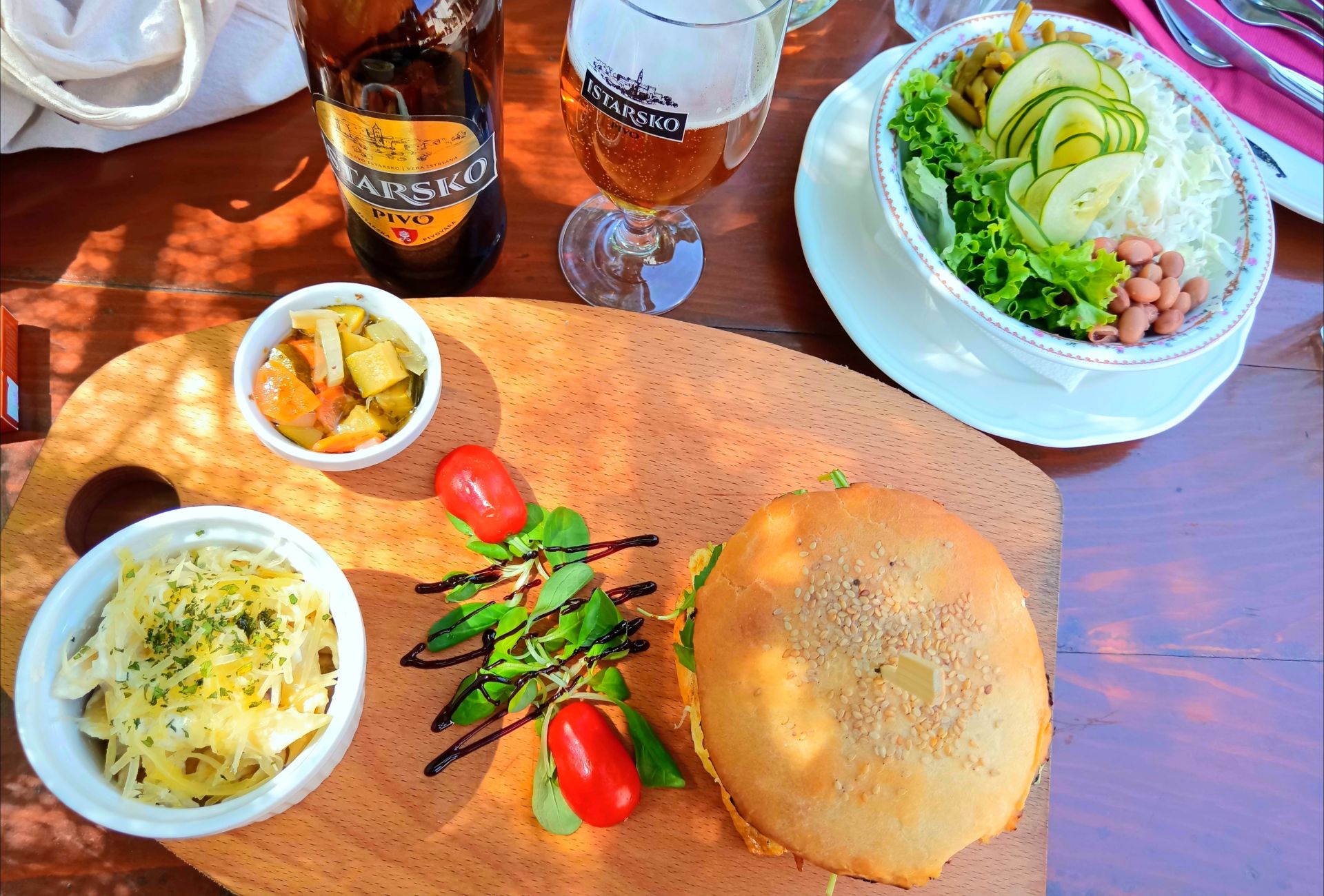 Okusi nisu toliko intenzivni, ali kad se spoje, daju jedan poseban gušt. Umjesto pomfrita, dobili smo preukusne fuže u umaku od istarskog češnjaka, a sa strane su nam poslužene i kisele tikvice, koje u Ročkoj konobi sami rade. ”Svako jelo ima svoju priču. Naš burger nije klasičan, namirnice smo stavili u jedan malo drugačiji, novi oblik, izbjegavali smo jake umake i sastojke koji bi eventualno prikrili kvalitetu domaćih namirnica”, objašnjava nam Nenad.