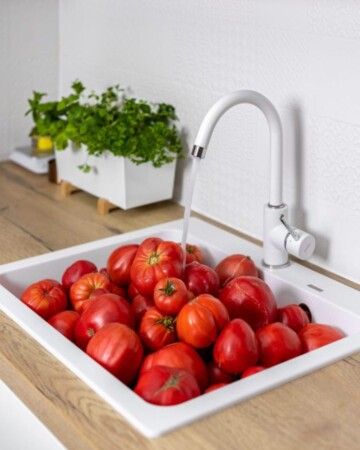 - Rajčice operite pod mlazom hladne vode. Prerežite ih na pola i nožem izdubite zeleni dio gdje je bila peteljka.