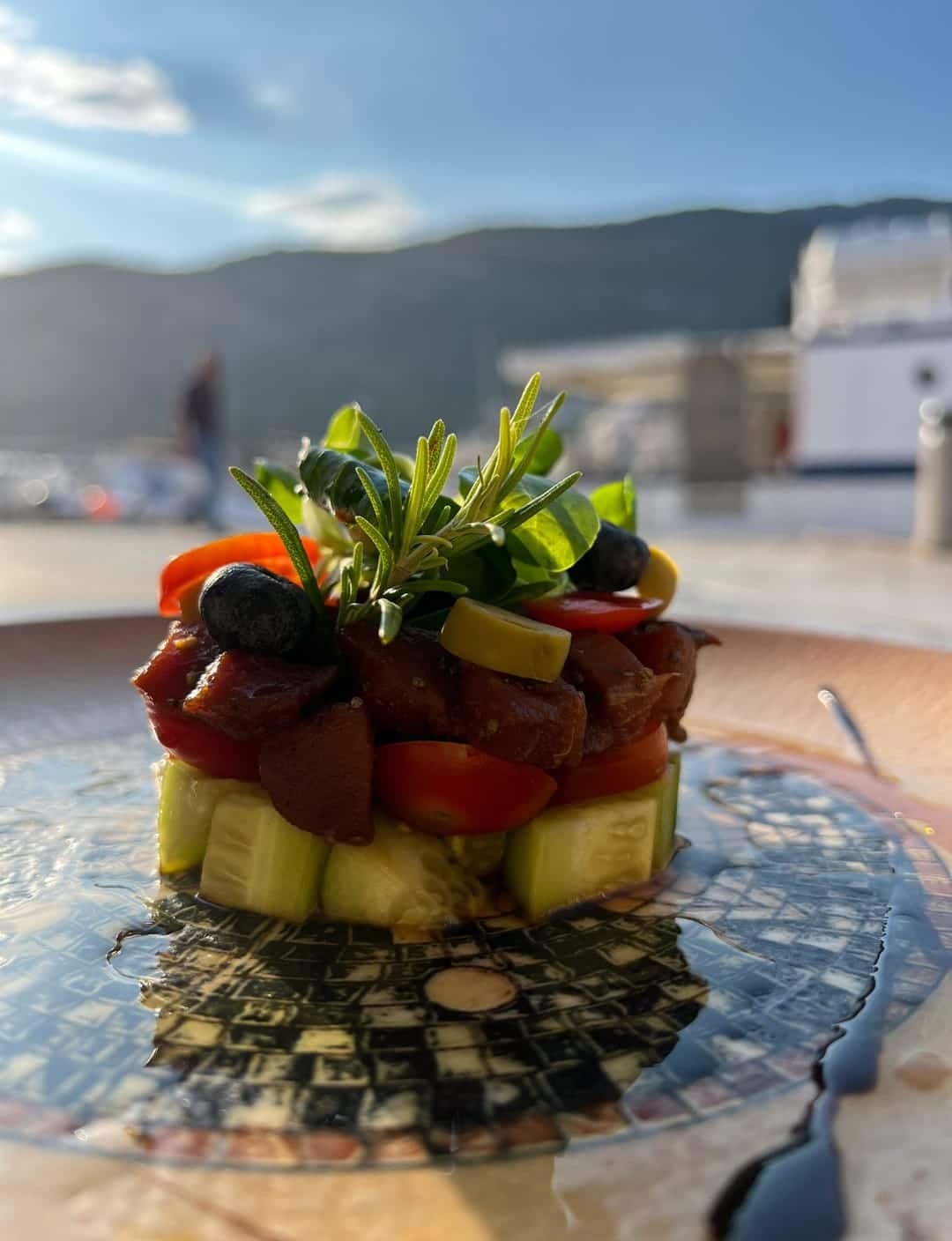Dalmatinski pršut, riblja pašteta, selekcija domaćih sireva, slavna komiška pogača, dagnje i škampe na buzaru, crni rižoto od sipe, hobotnica na ribarski, svježa riba… Sve je to samo dio bogate ponude magičnog restorana Dal Mare koji se smjestio tik do mora u srcu ribarskog gradića Komiže. Osim veličanstvenog izbora jela pripremljenih od ribe na tradicionalni dalmatinski način, ovaj komiški gastronomski biser se može pohvaliti i kvalitetnim izborom mesa, a gosti posebno hvale njihovu ljetnu terasa s impresivnim pogledom i ugodan ambijent. Imaju sjajan meni s isključivo domaćim namirnicama, interijer je predivan, osoblje ugodno i profesionalno, a hranu koju će vam poslužiti s pogledima koji pucaju na more, pamtit ćete zauvijek!
