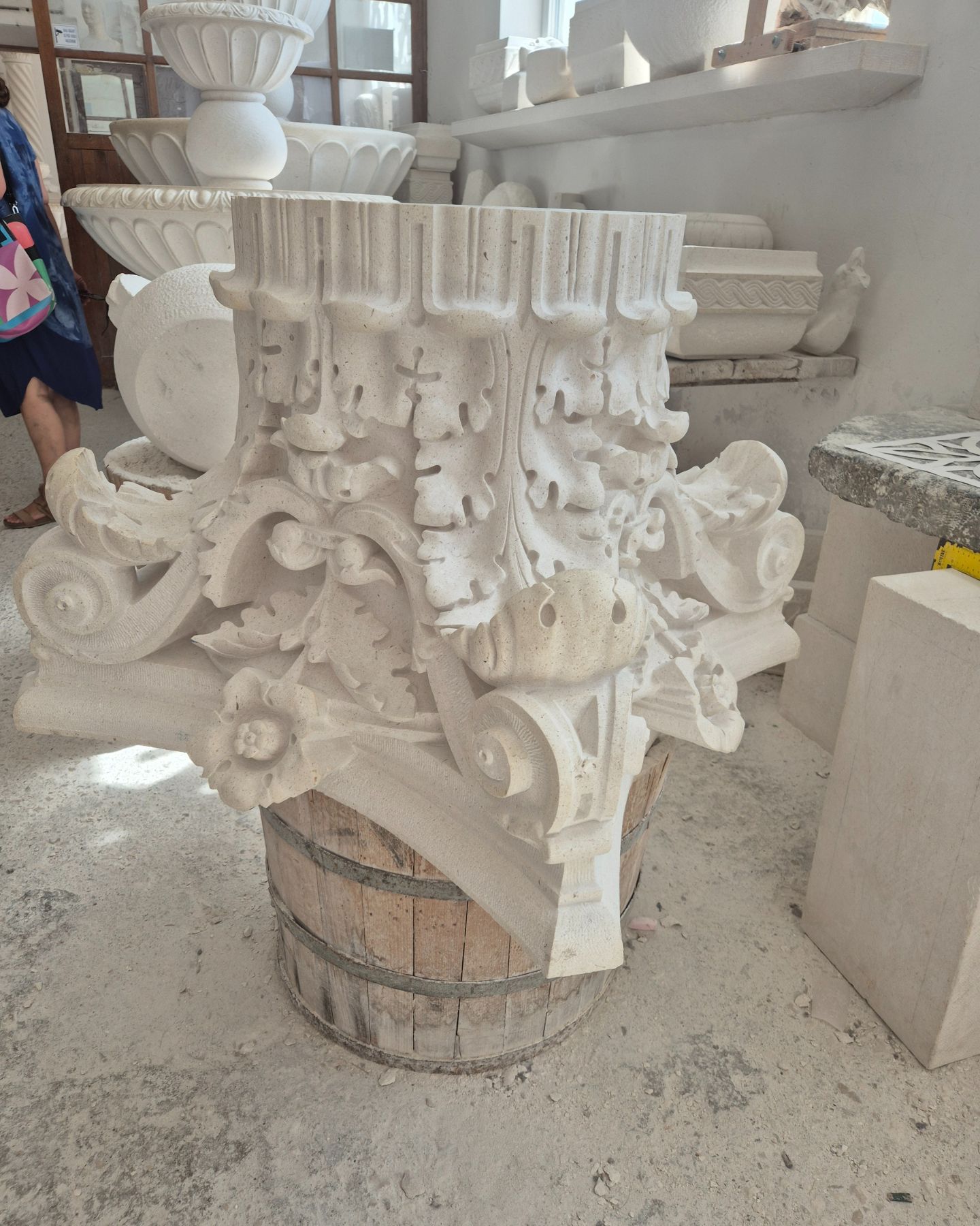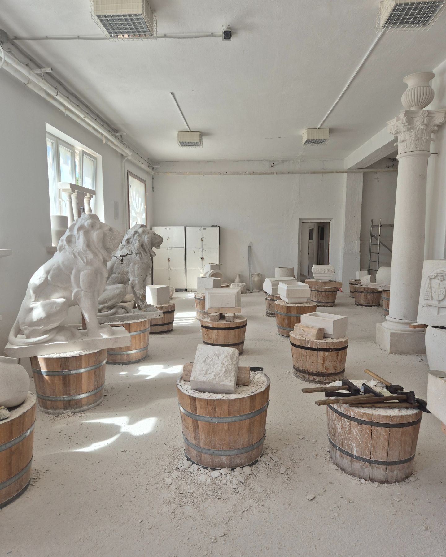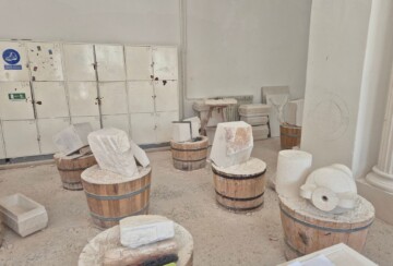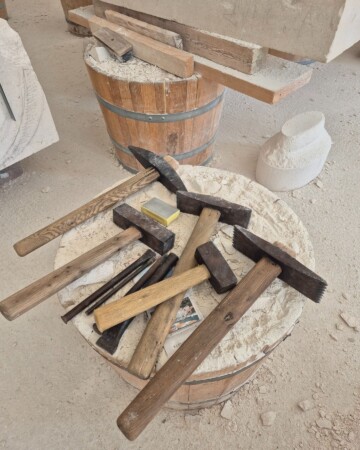 Prostorija je ispunjena kamenim skulpturama u različitim fazama dovršenosti te starim alatima. Naš nam vodič pokazuje kako se koristi svaki od alata, ističući kako je većinom riječ o starim alatima iz rimskog doba, uz par „novijih“ iznimaka koji su u upotrebu ušli prije 150 godina. Da, naglasak u programu škole je stavljen na ručnu obradu kamena, no škola ima i modernije strojeve poput zračnih kompresora i turbina.