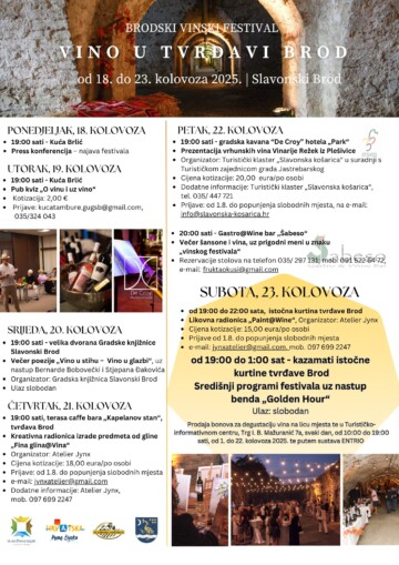 Upravo se u čarobnom ambijentu Tvrđave Brod, neizostavnog simbola grada iz 18. stoljeća, čuvarice granice na Savi, sljedećeg tjedna od 18. do 23. kolovoza 2025., održava festival Vino u Tvrđavi Brod. Na njemu će posjetitelji moću kušati brojna vina u čarobnom ambijentu, ali i sudjelovati u zabavnim popratnim događanjima kao što su pub kvizovi, likovne radionice, večeri poezije i šansone…