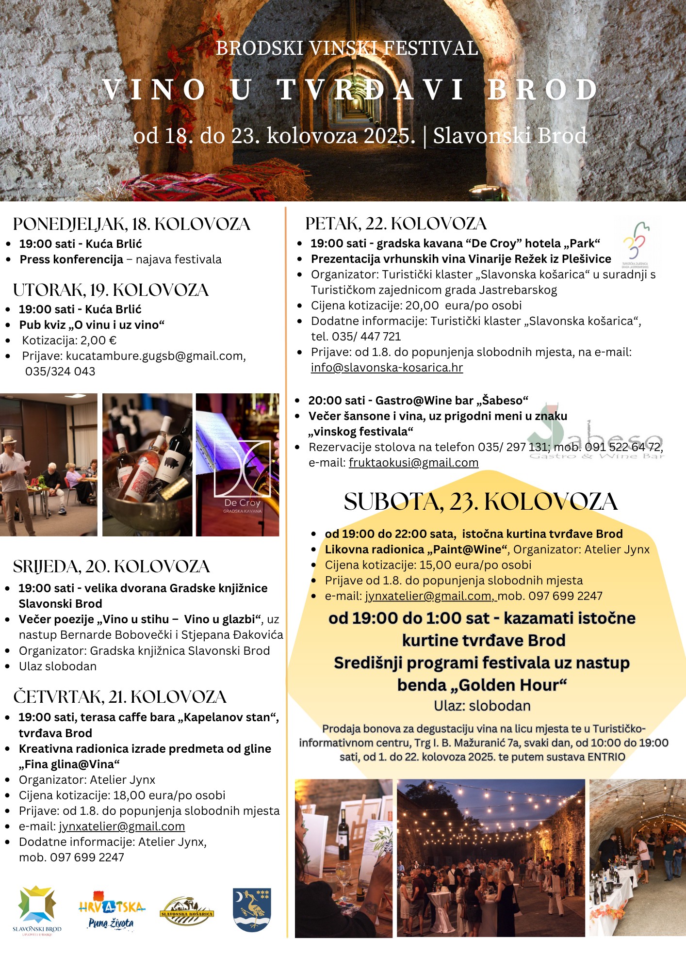 Centralni događaj na rasporedu je u subotu, 23. kolovoza, od 19 sati sve do 1 iza ponoći, u kazamatima istočne kurtine Tvrđave Brod, gdje će nastupiti bend „Golden Hour“. Ulaz na ovaj završni dio festivala je slobodan, s tim da se bonovi za degustaciju vina već sada mogu kupiti putem sustava Entrio te u Turističko-informativnom centru na Trgu I. B. Mažuranić 7 a, svaki dan od 10 do 19 sati, a na dan događanja i na licu mjesta.
