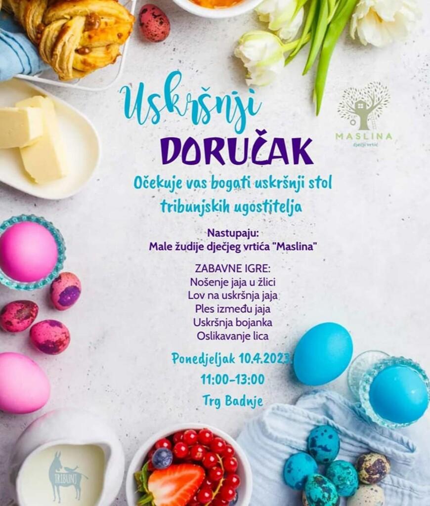 Kako najavljuju iz Turističke zajednice Općine Tribunj, u ponedjeljak, 10. travnja s početkom u 11 sati održat će se i bogati „Uskršnji doručak”. Posjetitelji će moći uživati u raznovrsnim delicijama i specijalitetima, zabavnim igrama koje će razveseliti najmanje te „Malim tribunjskim žudijama”, čuvarima tradicije i bogatog povijesnog nasljeđa.