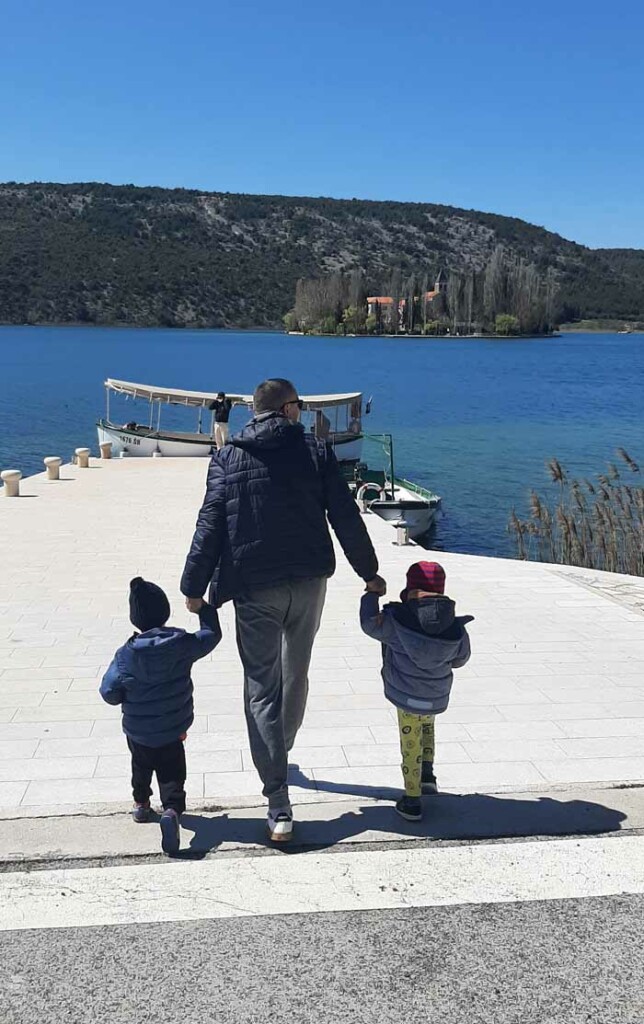 I prije samog dolaska na ovaj maleni otok nestvarne ljepote uvjerili smo se kako je taj dio nacionalnog parka Krka definitivno najbolji za obilazak s djecom. Spuštanje do malog brodskog pristaništa zavojitom cestom s pogledom na otok oduzima dah i već u samom autu je nastala borba na čijoj strani će se otok duže zadržati. U jednom trenutku sam pomislila da će sama vožnja do tamo, kao i bacanje kamenčića te hranjenje patki čekajući da brod isplovi biti sasvim dovoljno.